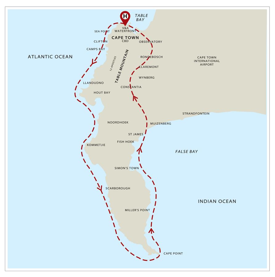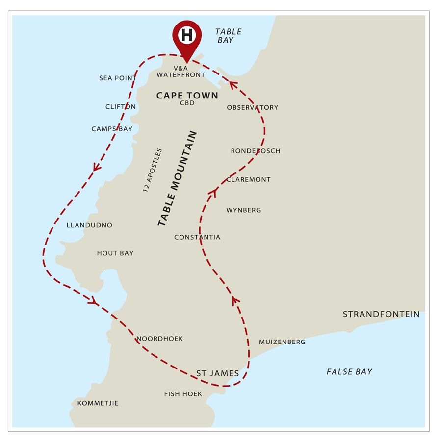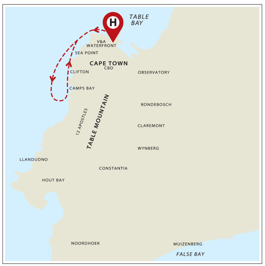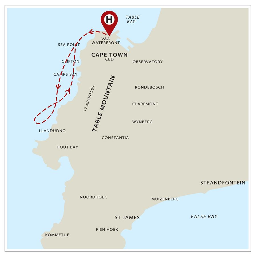 Soak in the panoramic views of the incredibly beautiful stretch of coast along the Atlantic Seaboard, from take-off at the Victoria & Alfred Waterfront, along the north shore of Table Mountain down the west side of the Cape Peninsula to Hout Bay, and then over to False Bay.